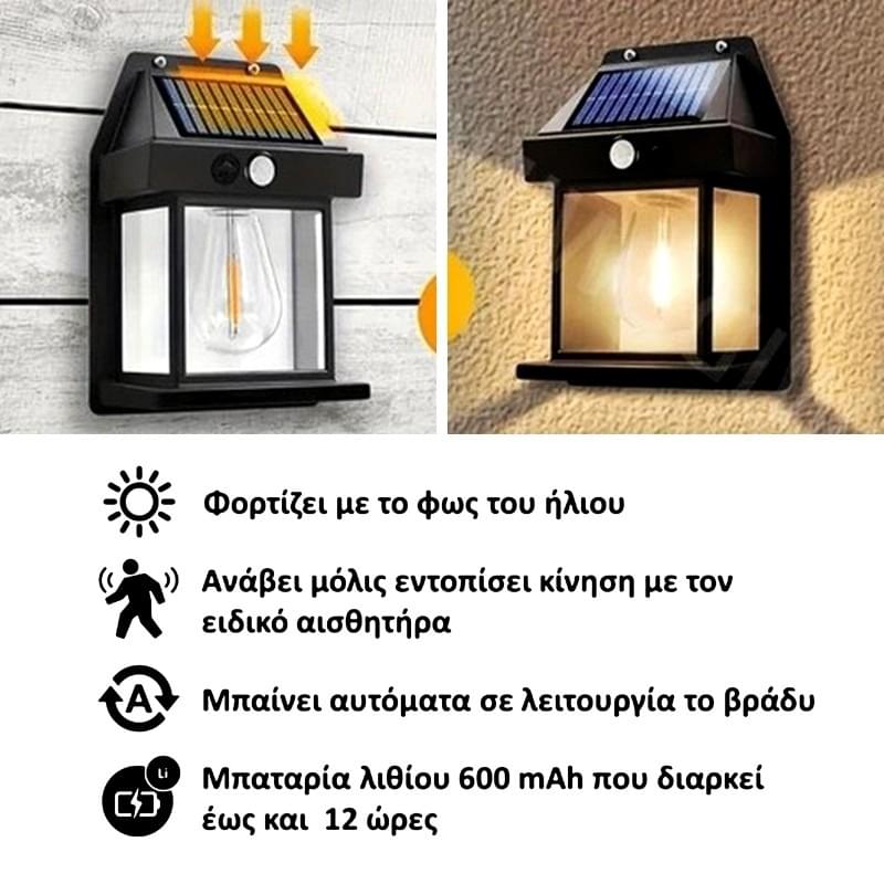 👉 Είναι ιδανικό για εξωτερικό φωτισμό. Ανάβει με απαλό φως όλο το βράδυ και διαθέτει ανιχνευτή κίνησης για να δυναμώνει  κάθε φορά που περνάει κάποιος